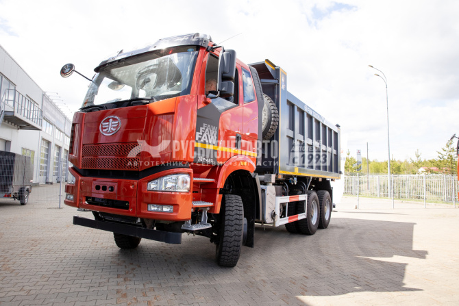 - Самосвал J6 3250 (6х6) — спецтехника усовершенствованной серии китайского автомобильного гиганта FAW. Отличается высокой надёжностью и невысокой стоимостью владения. - Двигатель 420 л.с. (CA6DM2-42E51), Евро 5 (мочевина). - Турбокомпрессор Holset (Великобритания). - ТНВД и топливные форсунки Bosch (Германия). - КПП CA10TAX190M2 - Механическая 10-ступенчатая, несинхронизированная, с демультипликатором - Кабина с одним спальным местом, кондиционер, кузов китайского производства. - Тип кузова П-образный, грузоподъёмность самосвала - 22160 кг - Геометрические параметры кузова: 5 400 x 2 300 x 1 600мм, объем кузова 19,9 м3. - Эргономичный современный дизайн рабочего пространства водителя. - Самосвал оснащён стандартным квадратным кузовом с задней разгрузкой (максимальный угол подъёма — 52 градуса).
